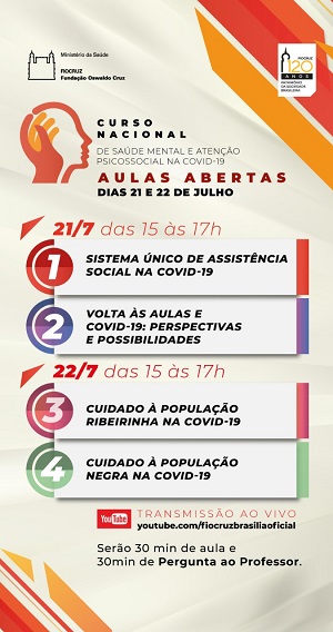 As aulas do curso Nacional de Atenção Psicossocial e Saúde Mental na Covid-19 encerram nesta quarta-feira (15/7), mas, a pedido dos alunos, serão realizadas quatro aulas abertas nos dias 21 e 22 de julho.