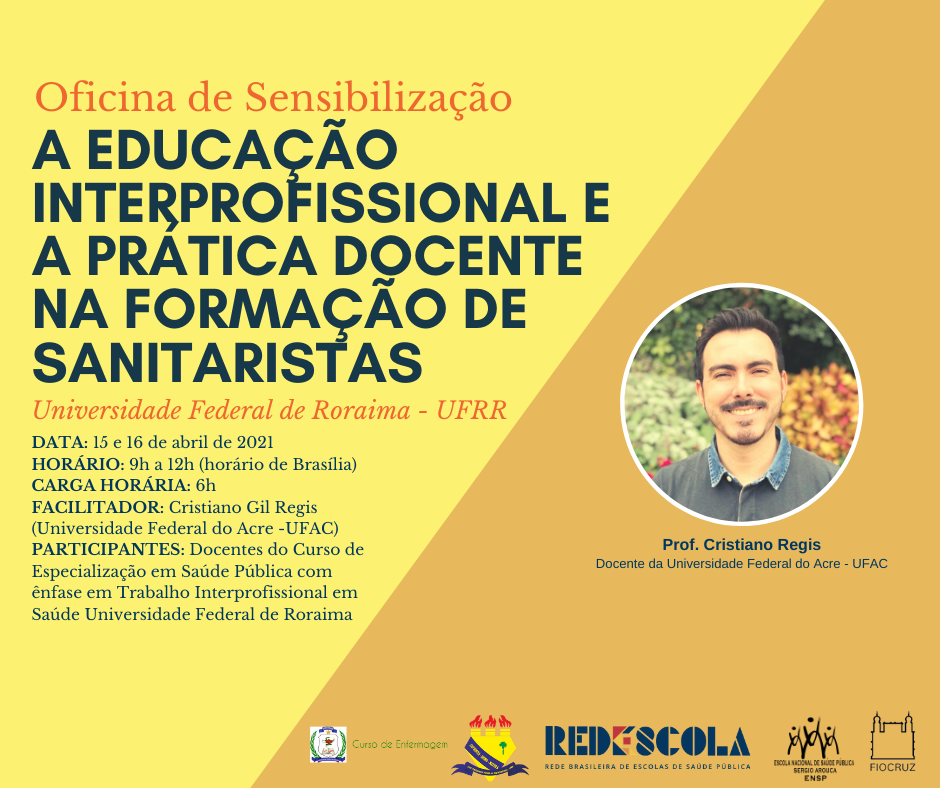 A Oficina tem como objetivo dotar os docentes que ministrarão o Curso de Especialização em Saúde Pública da Universidade Federal de Roraima. curso esse que faz parte do projeto Nova Formação em Saúde Pública na Rede Brasileira de Escolas de Saúde Pública: uma abordagem interprofissional, uma parceria entre a Escola Nacional de Saúde Pública Sergio Arouca(ESNP/Fiocruz) e do Ministério da Saúde ,por meio da Secretaria de Gestão do Trabalho e da Educação na Saúde (SGETS) e com coordenação nacional e cargo da Rede Brasileira de Escolas de Saúde Pública(RedEscola).