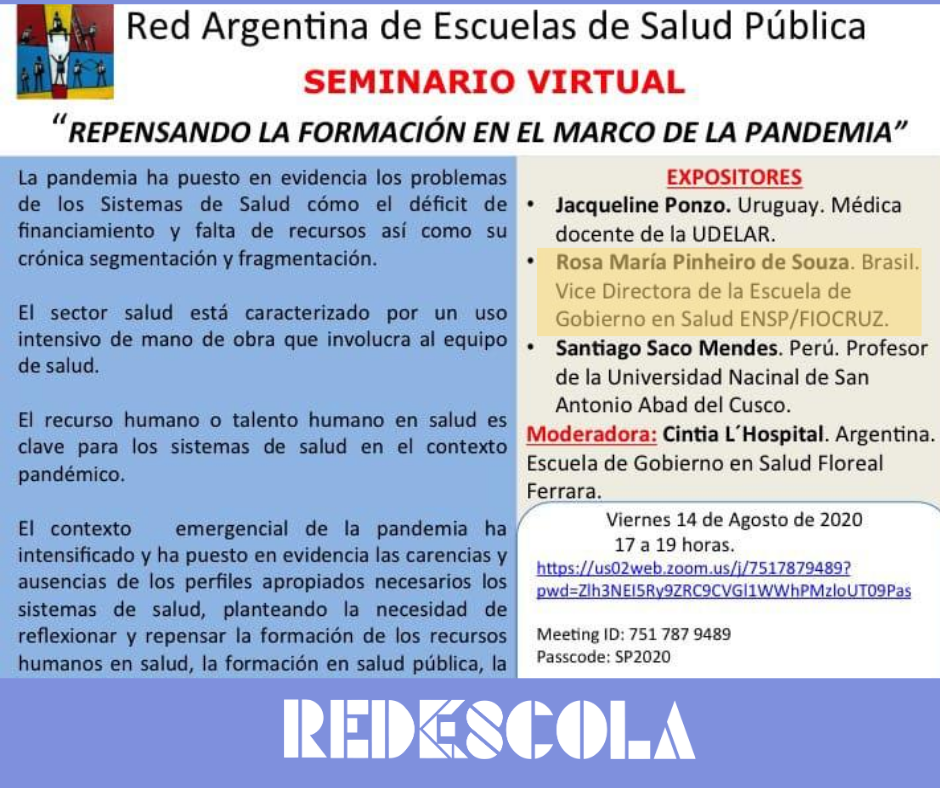 El Seminario Virtual de la Red Argentina de Escuelas Públicas de Salud ( Resp AR ), con el tema "Repensando La Formación en el Marco de la Pandemia" se realiza el viernes 14/08. Este seminario contará con la participación de la Profesora Rosa Souza, Vice Directora de la Escuela de Gobierno en Salud. VDEGS ENSP/Fiocruz y Coordinadora de la Secretaría Técnica y Ejecutiva de la Rede Brasileira de Escolas de Saúde Pública abordando el tema "La formación de salubristas con énfasis en la Educación Interprofesional: la experiencia de la Red Brasileña de Escuelas de Salud Publica."