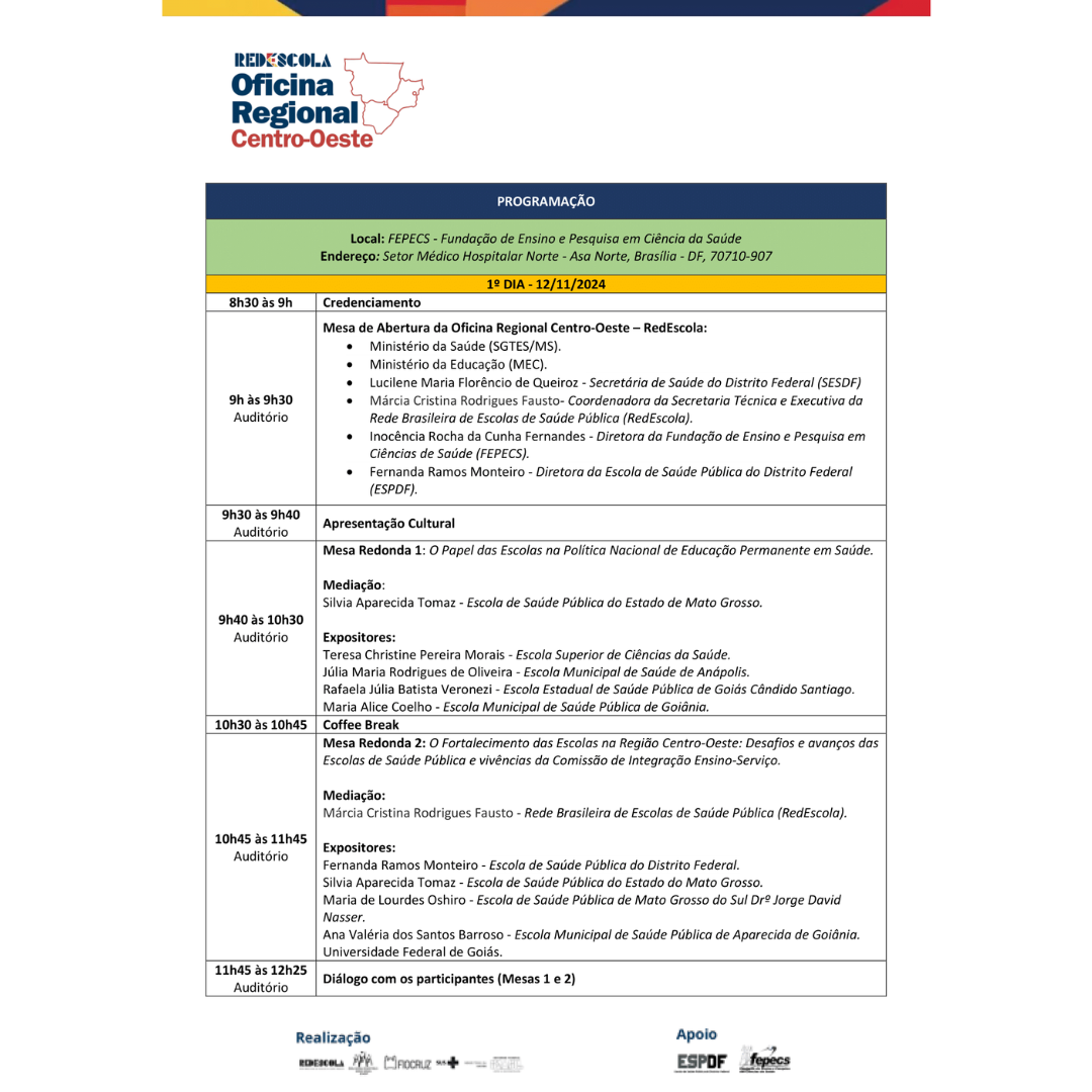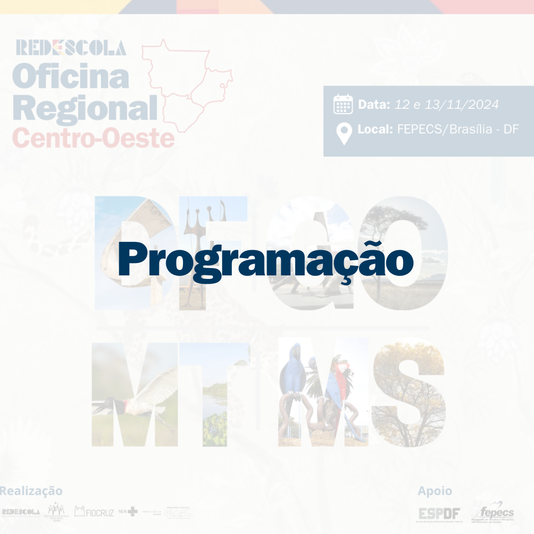 A Rede Brasileira de Escolas de Saúde Pública (RedEscola), com o apoio especial da Escola de Saúde Pública do Distrito Federal, realizará a Oficina Regional Centro-Oeste - RedEscola nos dias 12 e 13 de novembro de 2024 em Brasília/DF.