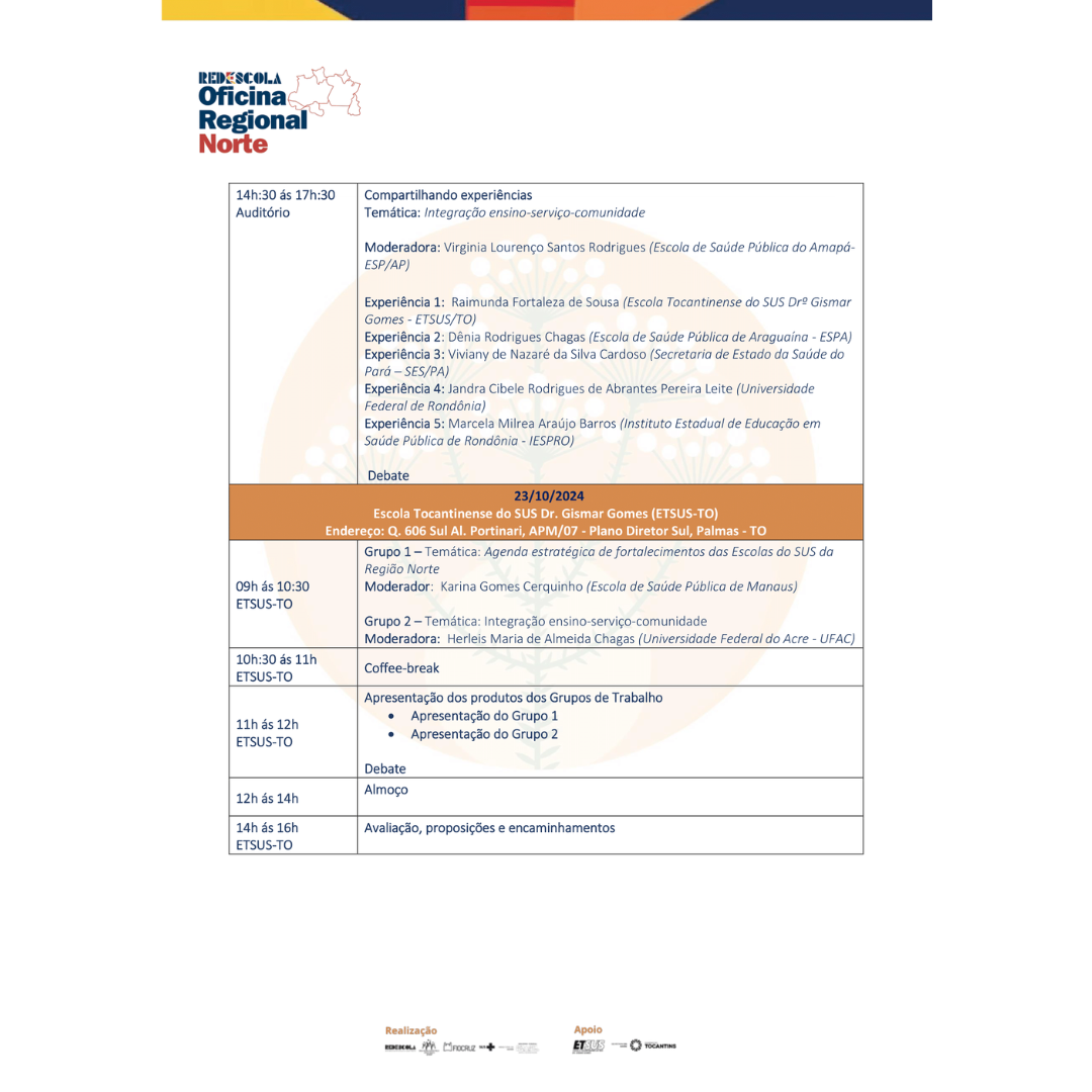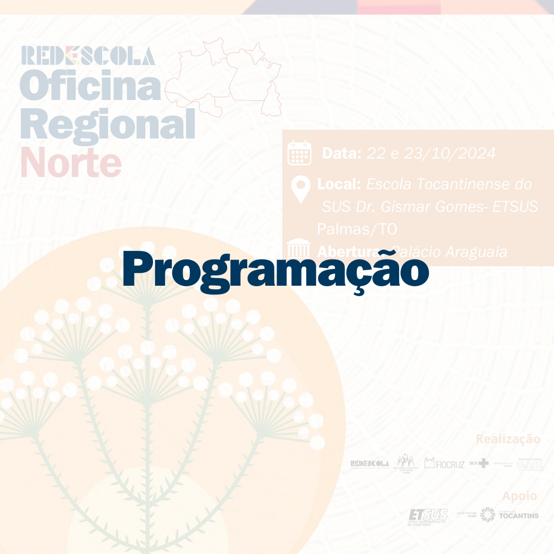 A Rede Brasileira de Escolas de Saúde Pública (RedEscola), com o apoio da Escola Tocantinense do SUS Drº Gismar Gomes - ETSUS, realizará a Oficina Regional Norte - RedEscola, nos dias 22 e 23 de outubro de 2024, na cidade de Palmas/TO.
