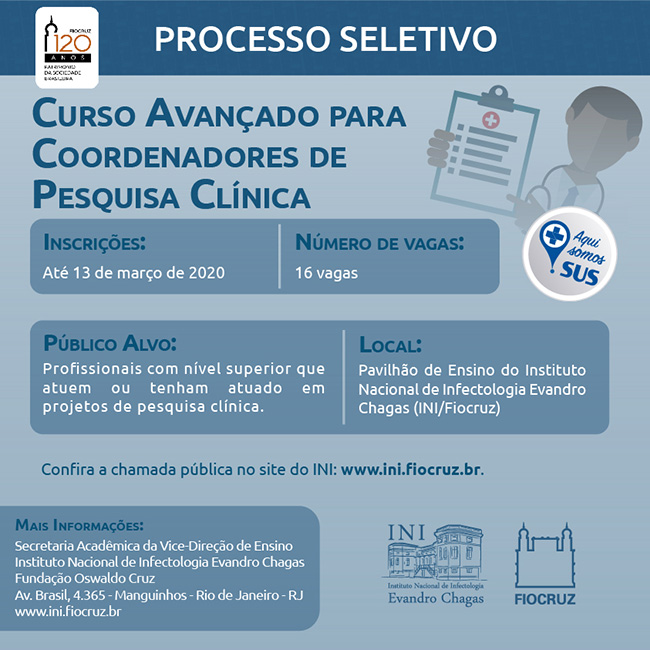 Estão abertas, até o dia 13 de março, as inscrições para o processo seletivo do Curso Avançado para Coordenadores de Pesquisa Clínica. Coordenada por Jennifer Salgueiro, a capacitação pretende discutir e aprofundar, de modo crítico, as atividades, processos e ferramentas envolvidas nas práticas cotidianas relacionadas à coordenação de estudos clínicos, apresentando bases teórico-metodológicas e promovendo reflexões sobre as várias áreas envolvidas no processo. Confira o edital completo e faça sua inscrição em www.ini.fiocruz.br