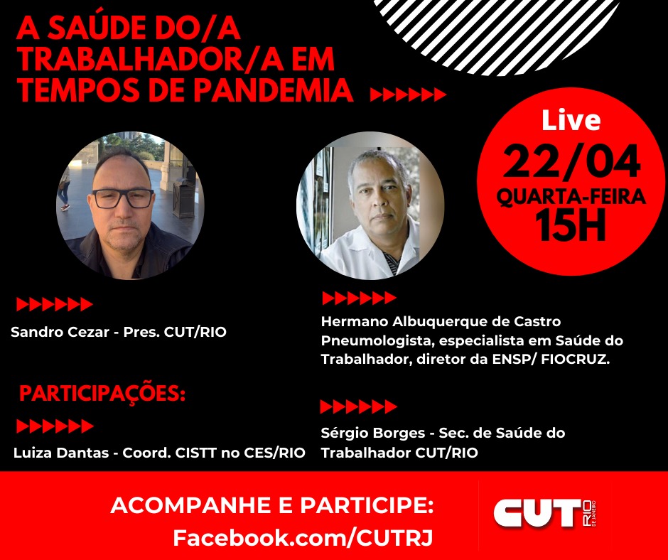 Participe da live com o diretor da @ensp_fiocruz Hermano de Castro, Luiza Dantas (CES/RIO), Sérgio Borges (CUT/RIO) e Sandro Cezar, presidente da CUT/Rio.