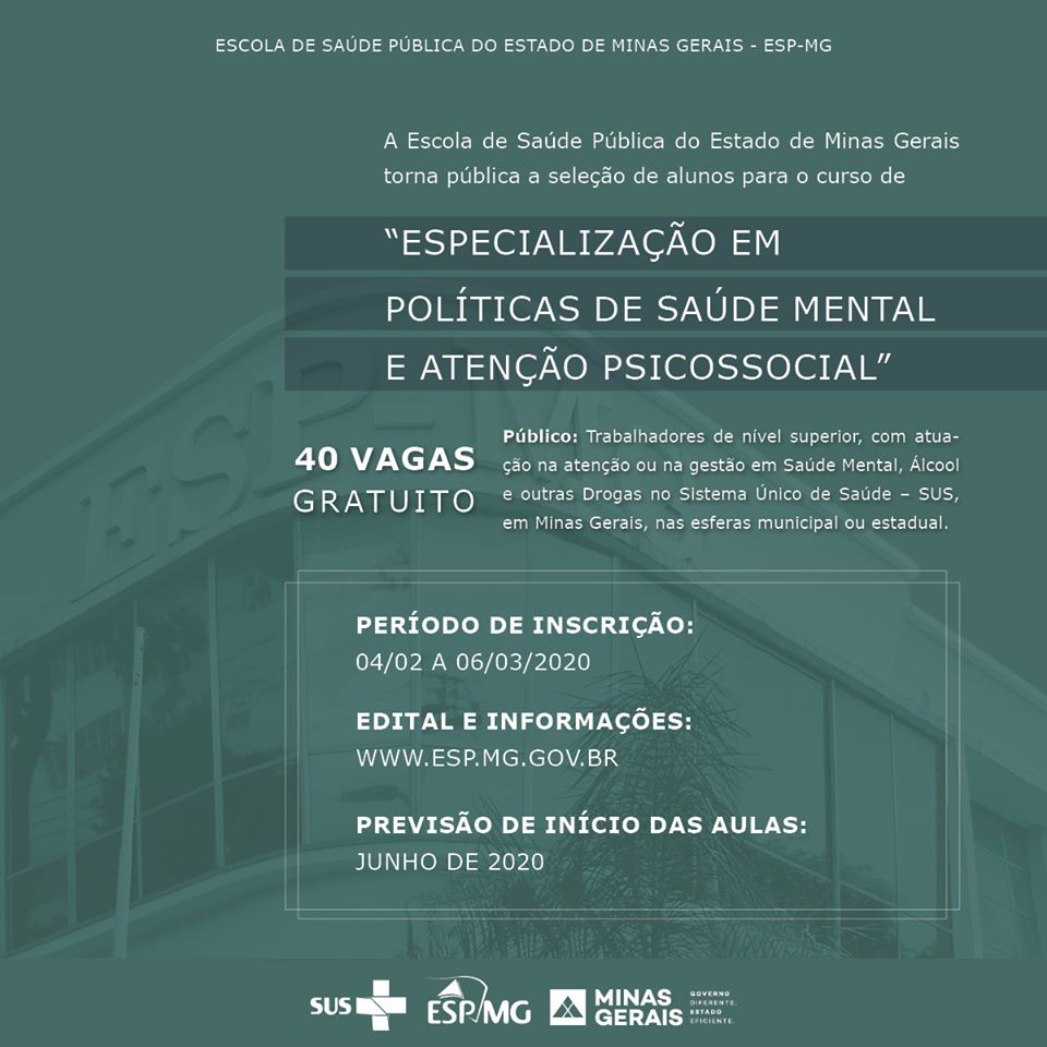 A Escola de Saúde Pública de Minas Gerais (ESP-MG) seleciona alunos para turma do novo Curso de Pós-Graduação lato sensu “Especialização em Políticas de Saúde Mental e Atenção Psicossocial”. As inscrições começam hoje, terça-feira dia 04, e vão até dia 06 de março.