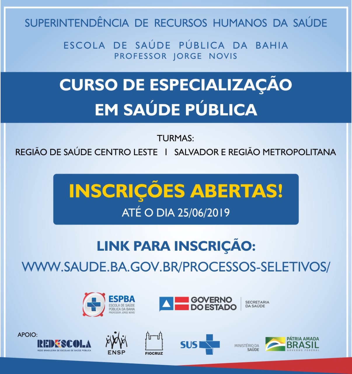 A Escola de Saúde Pública da Bahia Professor Jorge Novis (ESPBA), parte da estrutura organizacional da Superintendência de Recursos Humanos (SUPERH) da Secretaria de Saúde do Estado da Bahia (SESAB) divulga o Edital que regulamenta as inscrições para o processo seletivo de discentes para o Curso de Especialização em Saúde Pública. A iniciativa tem o apoio da Escola Nacional de Saúde Pública Sérgio Arouca (ENSP/Fiocruz) e da Rede Brasileira de Escolas de Saúde Pública (RedEscola).