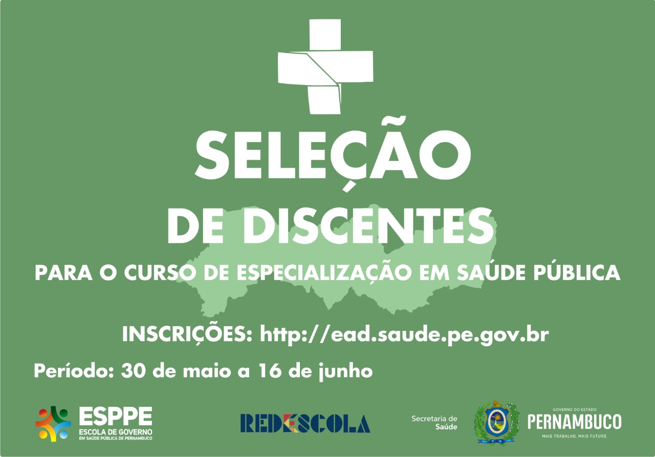 A Secretaria Estadual de Saúde de Pernambuco, através da Secretaria Executiva de Gestão do Trabalho e Educação na Saúde (SEGTES), em parceria com a Rede Brasileira de Escolas de Saúde Pública (RedEscola), torna pública, por meio de edital, as normas para o processo de seleção de Discentes do Curso de Especialização Lato Sensu em Saúde Pública, que será executado por meio da Escola de Governo em Saúde Pública de Pernambuco (ESPPE).