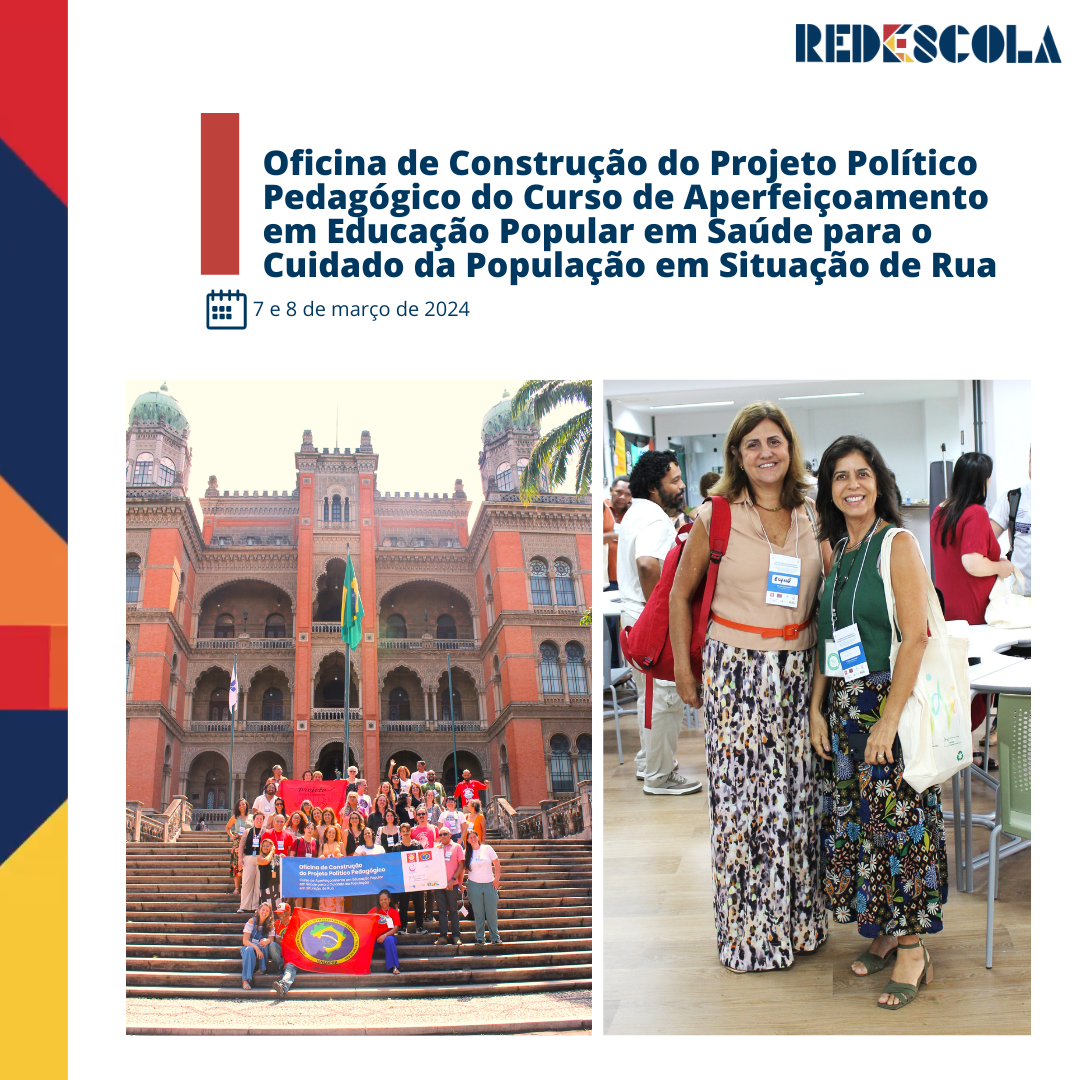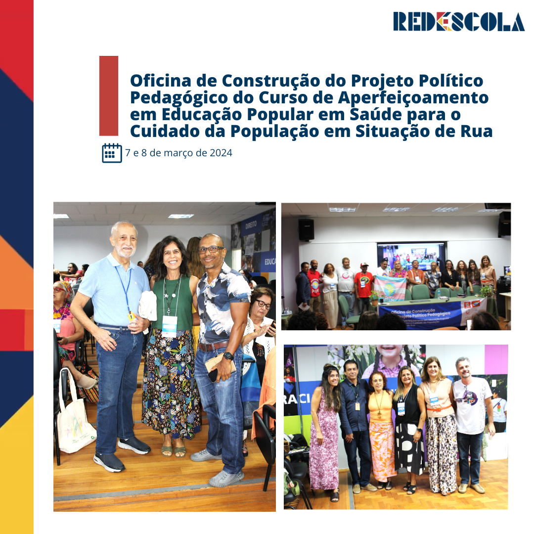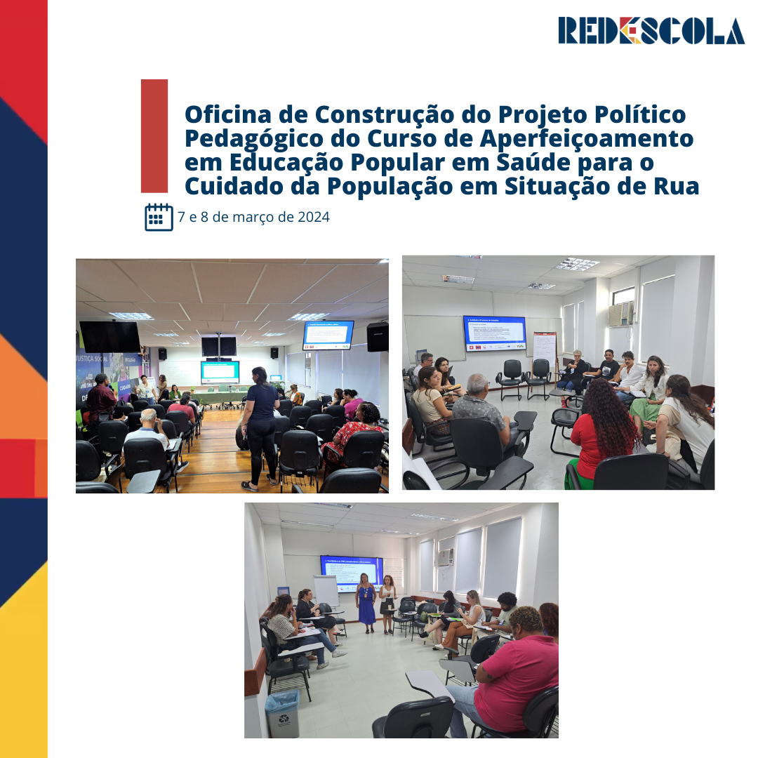 Aconteceu nos dias 7 e 8 de março, na Escola Nacional de Saúde Pública Sérgio Arouca (ENSP/Fiocruz) a Oficina de Construção do Projeto Político Pedagógico do Curso de Aperfeiçoamento em Educação Popular em Saúde para o Cuidado da População em Situação de Rua. Este projeto conta com parcerias da Fundação Oswaldo Cruz (Fiocruz), Escola Nacional de Saúde Pública (ENSP/Fiocruz) , da Coordenação de Acesso e Equidade CAEQ/SAPS/Ministério da Saúde,, dos movimentos sociais e instituições de ensino e redes parceiras tais como a Rede Brasileira de Escolas de Saúde Pública (RedEscola).